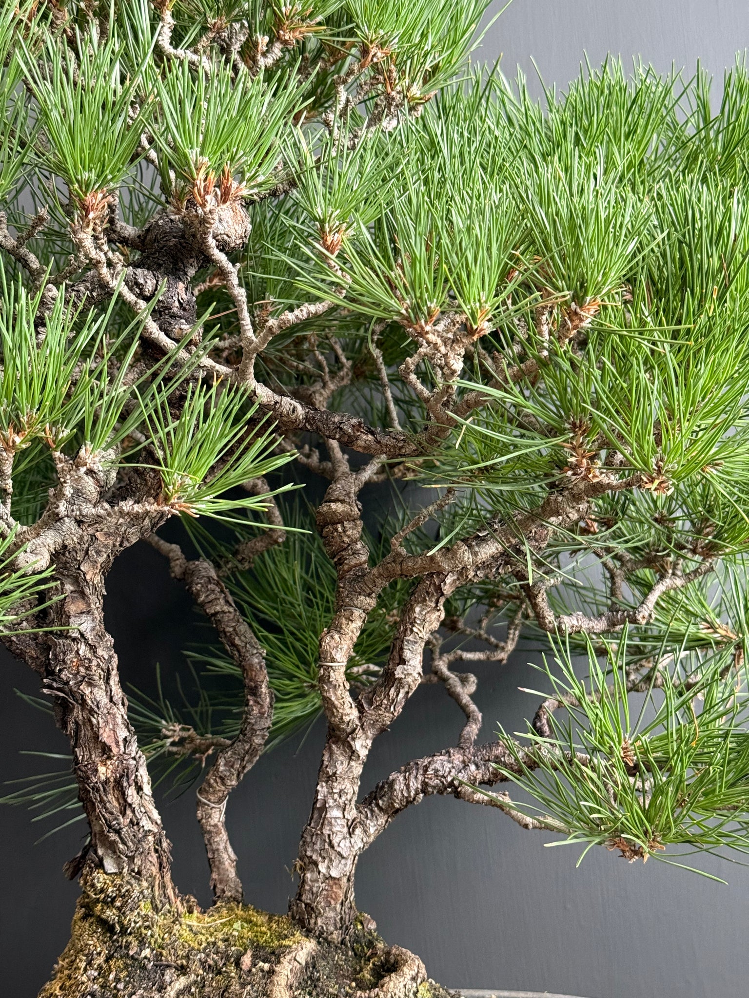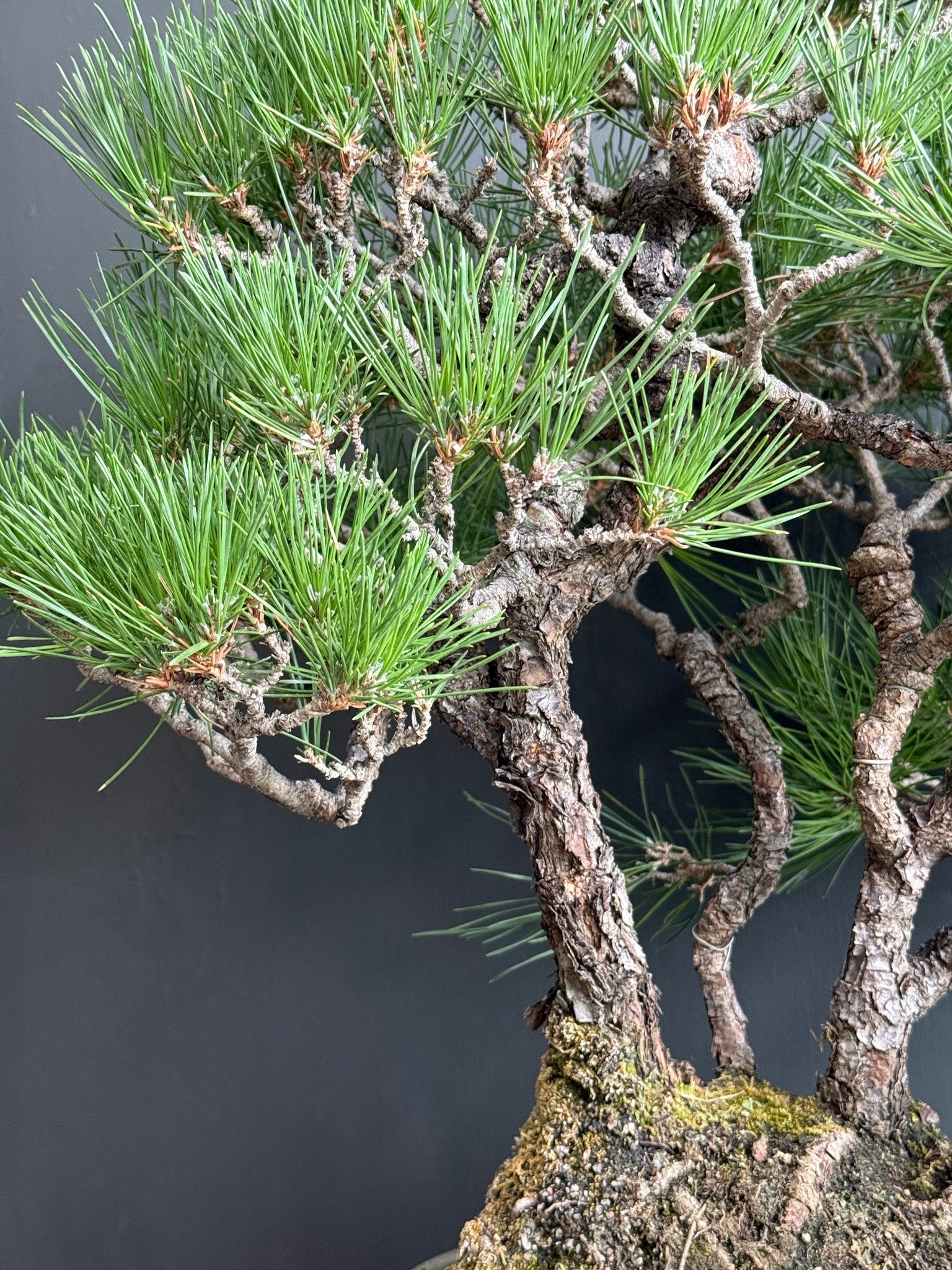 其針葉成對生長,葉質粗壯挺拔,葉色濃綠,四季常青,樹皮灰黑粗裂,極具蒼勁古雅之美。幹姿雄渾,枝條層次分明,是日本盆景美學的象徵性樹種之一。早在平安時代起,黑松便象徵長壽與不朽,至今仍廣泛應用於盆景藝術與慶典裝飾,代表歲寒堅毅與生命延續的精神。